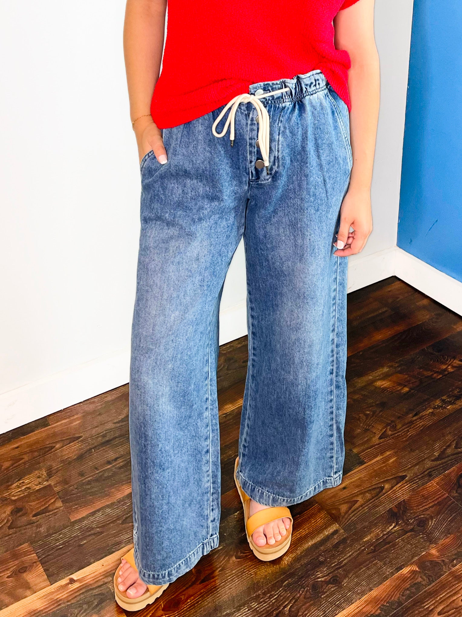 Step into comfort and style with the Alba Wide Leg Drawstring Denim Pants. Featuring a relaxed wide-leg fit and an adjustable drawstring waist, these pants offer effortless ease all day long. The button closure adds a classic touch, while handy side pockets keep your essentials close. Perfect for playful days and casual adventures!
