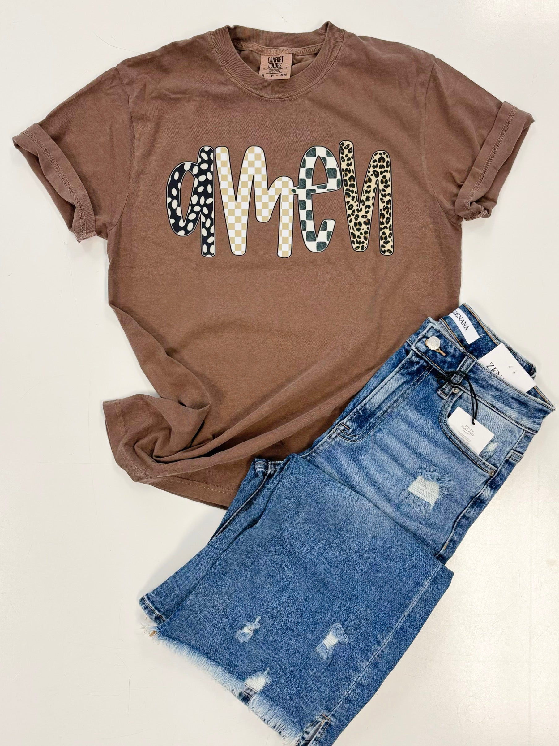 The Amen Tee is a must-have for every fashion enthusiast. With its patterned letters, dots, checkered and leopard designs, this tee adds a touch of edginess to any outfit. Made with quality material, the Amen Tee offers both style and comfort.
