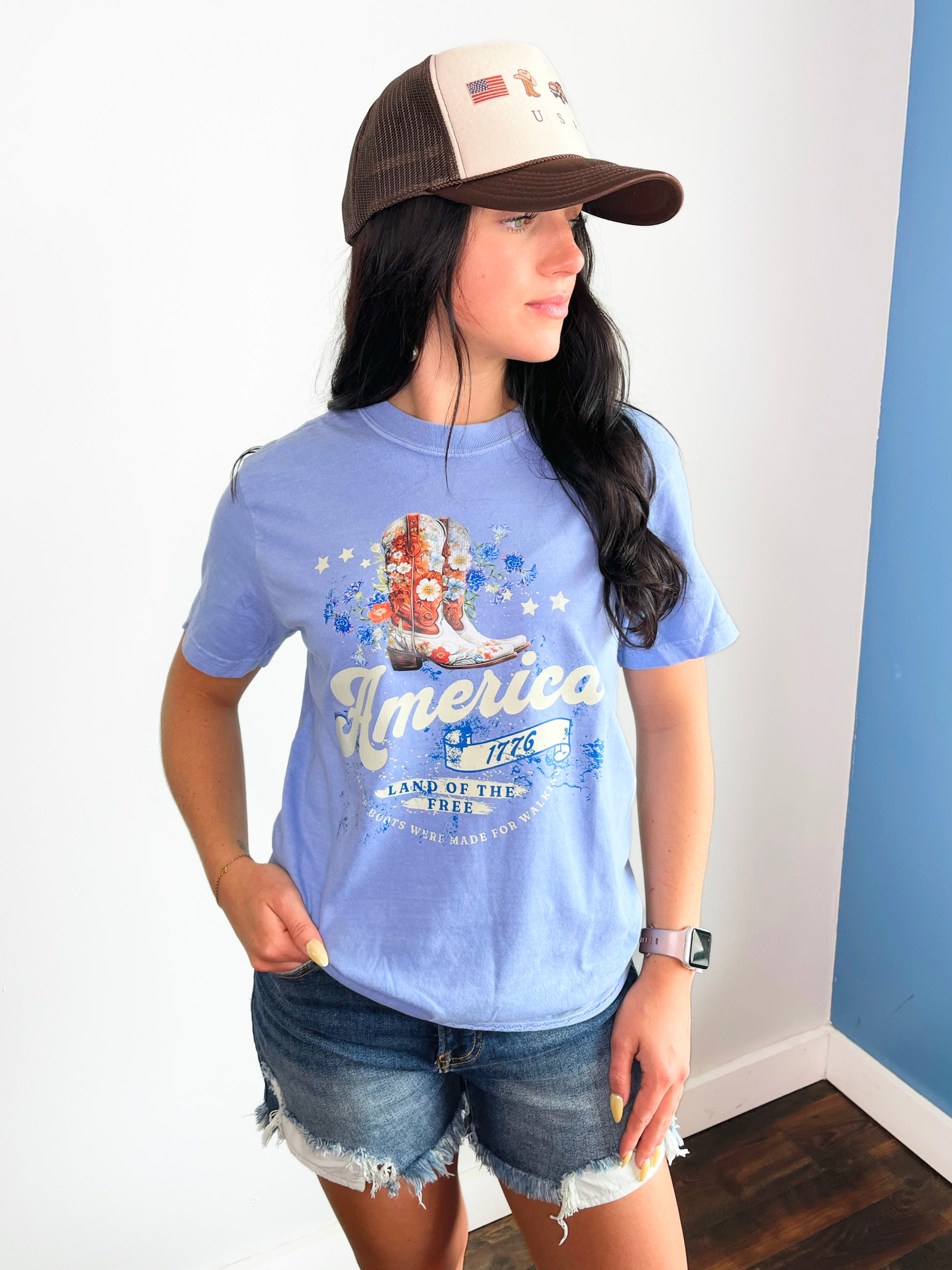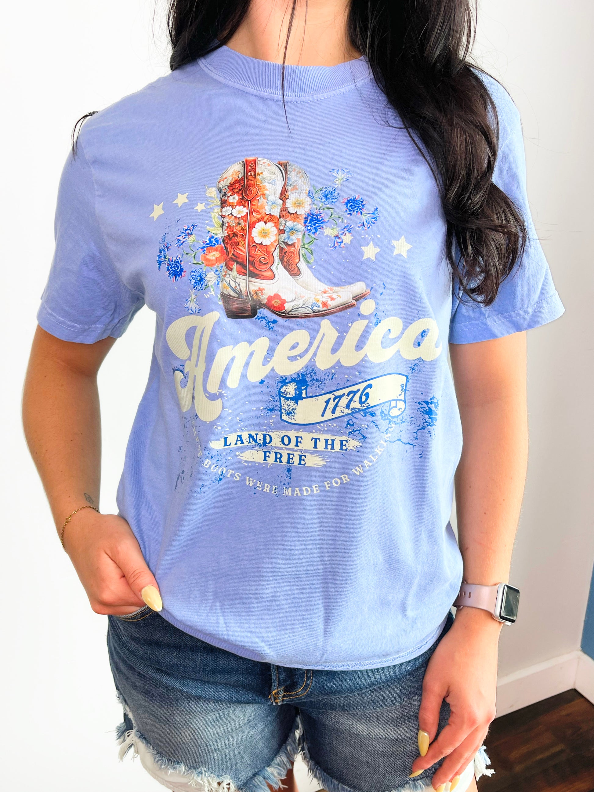 Show your patriotic spirit with our "America Land of the Free" tee! This playful design pairs perfectly with your favorite cowboy boots for that all-American look. Strut your stuff from backyard barbecues to firework displays with this comfortable, eye-catching shirt that celebrates the stars and stripes in style.