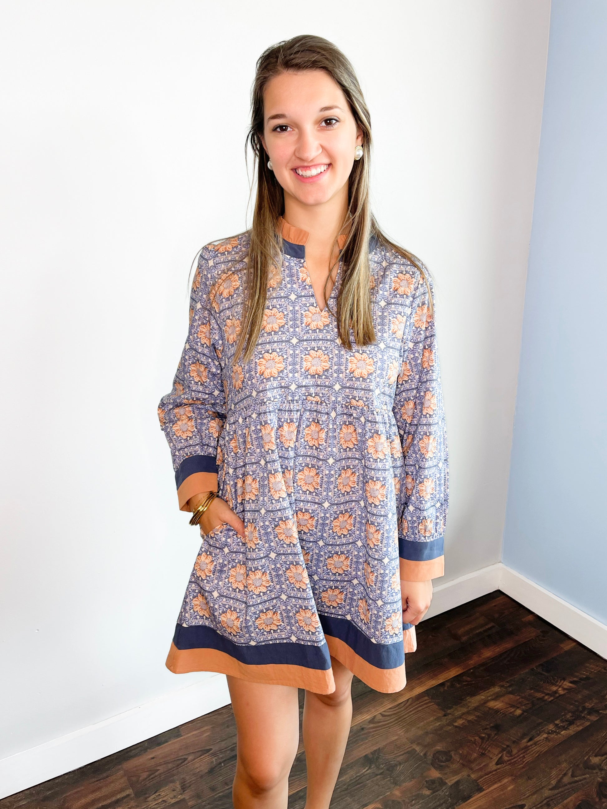 Step into fall with the Anita Ruffled Neck Floral Dress, a playful blend of cozy and cute. This long-sleeve dress features a ruffled neckline and charming floral crochet patchwork, perfectly paired with a solid contrast that adds warmth to the design. Side pockets bring effortless style and practicality, making it ideal for crisp autumn days filled with fun and adventure.