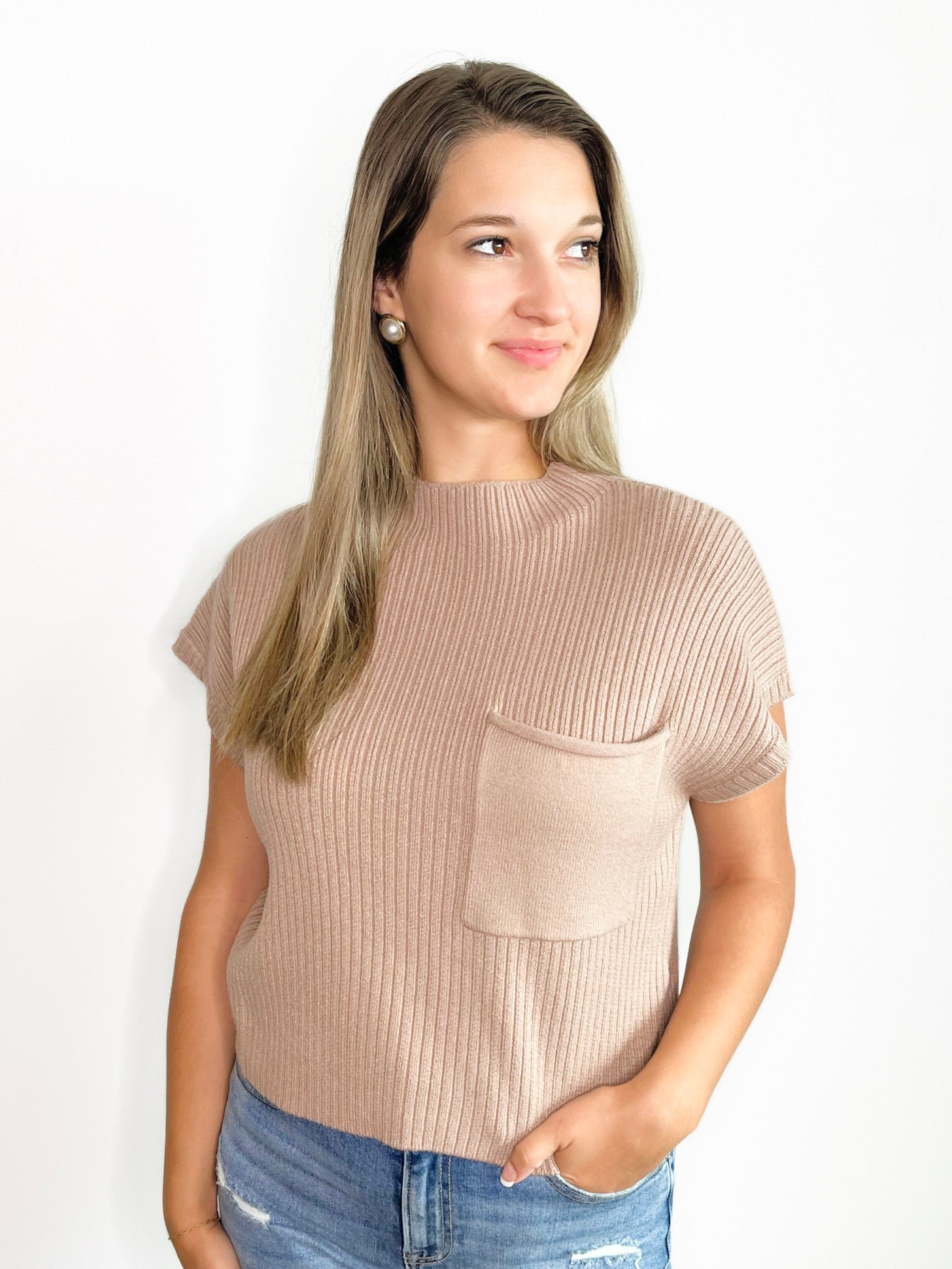 Stay cozy and stylish with the Arianna Mock Neck Sweater Top! This top features a playful mock neck, short sleeves, and a convenient pocket detail. Transition effortlessly into fall with the soft sweater knit material. You'll be trendy and ready for anything!