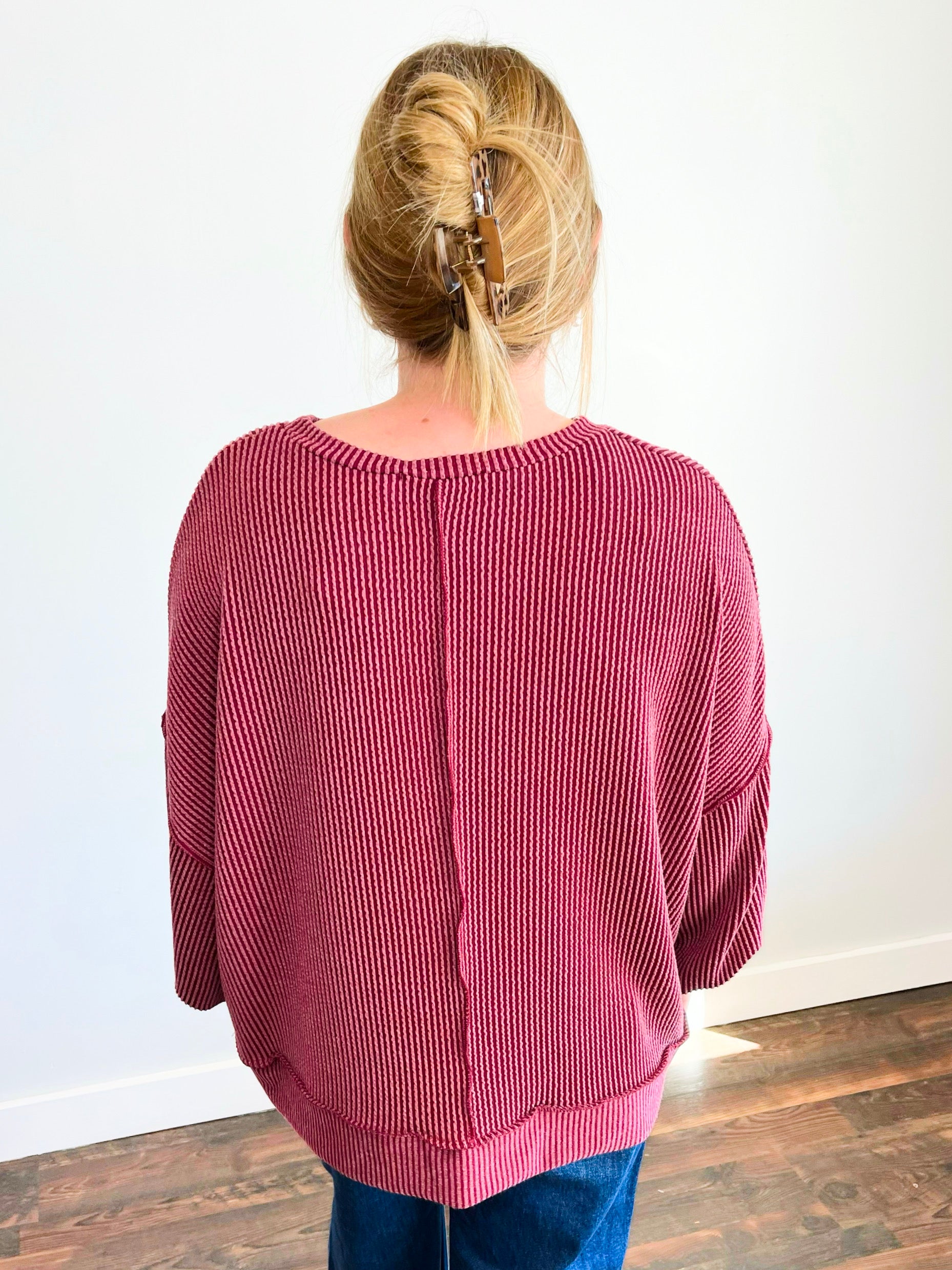 Cozy up this fall in the Bella Ribbed Knit Sweater Top. Its playful wine color and soft ribbed knit make every casual moment feel special. The round neck and drop shoulders add a relaxed vibe, while the reverse bottom band gives it a fun twist. Perfect for layering or wearing solo, this sweater keeps you comfy with a stylish edge all season long.