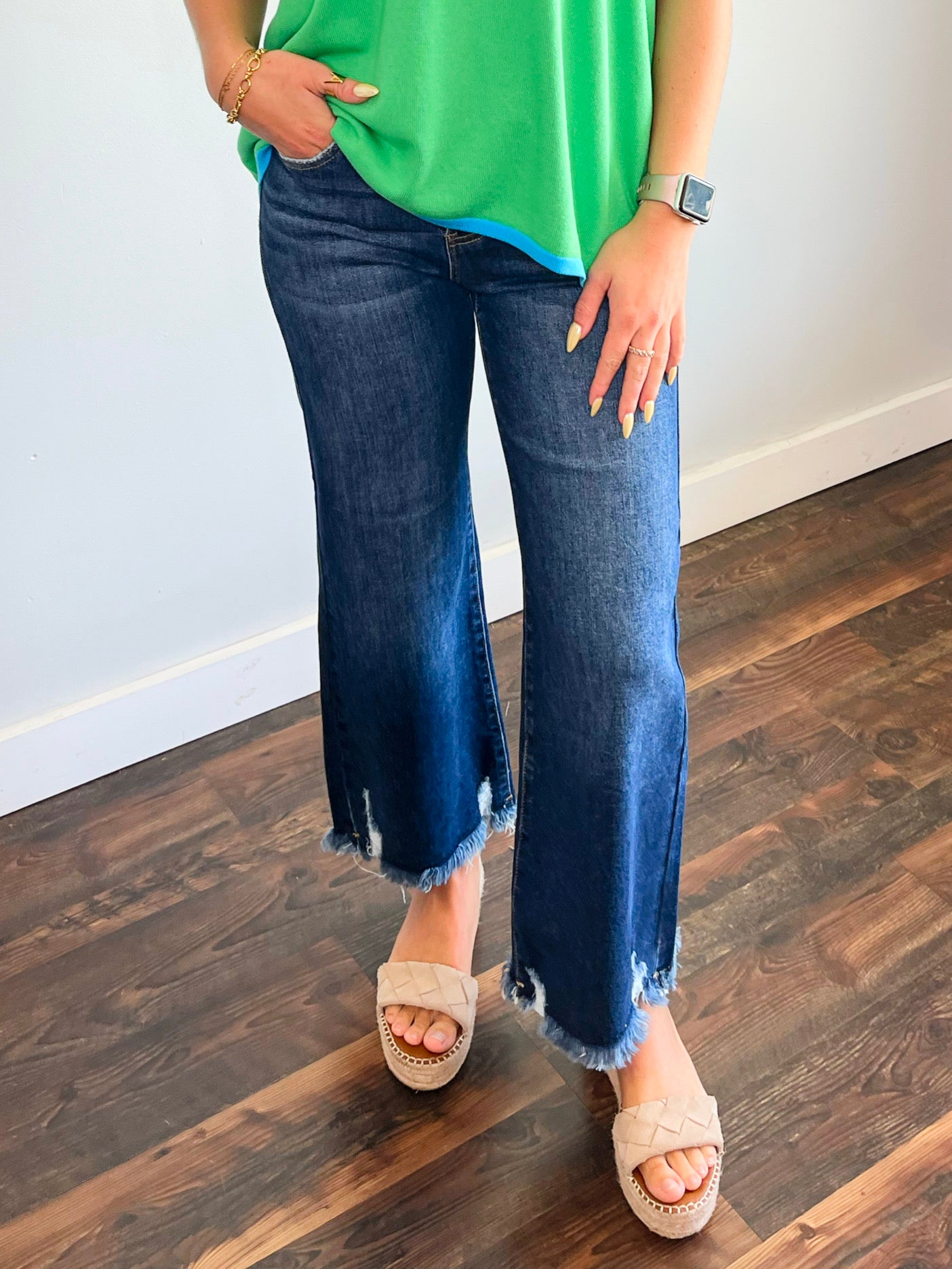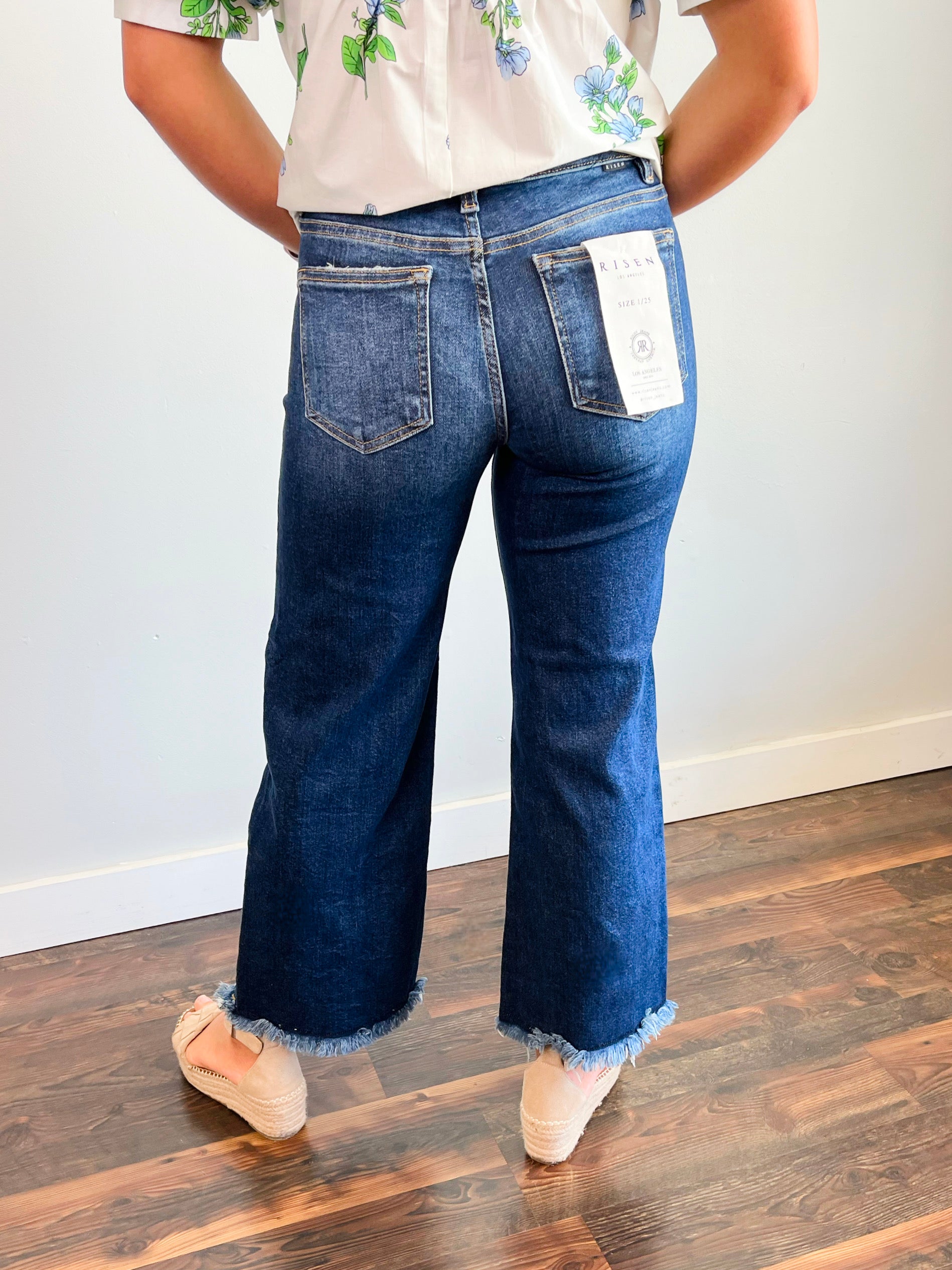 Get ready to turn heads in these Bentley Crop Wide Leg Jeans! With a trendy wide leg and mid rise, these cropped jeans will elevate any outfit. Plus, the distressed hem adds a playful touch. Look effortlessly cool in these must-have dark jeans.