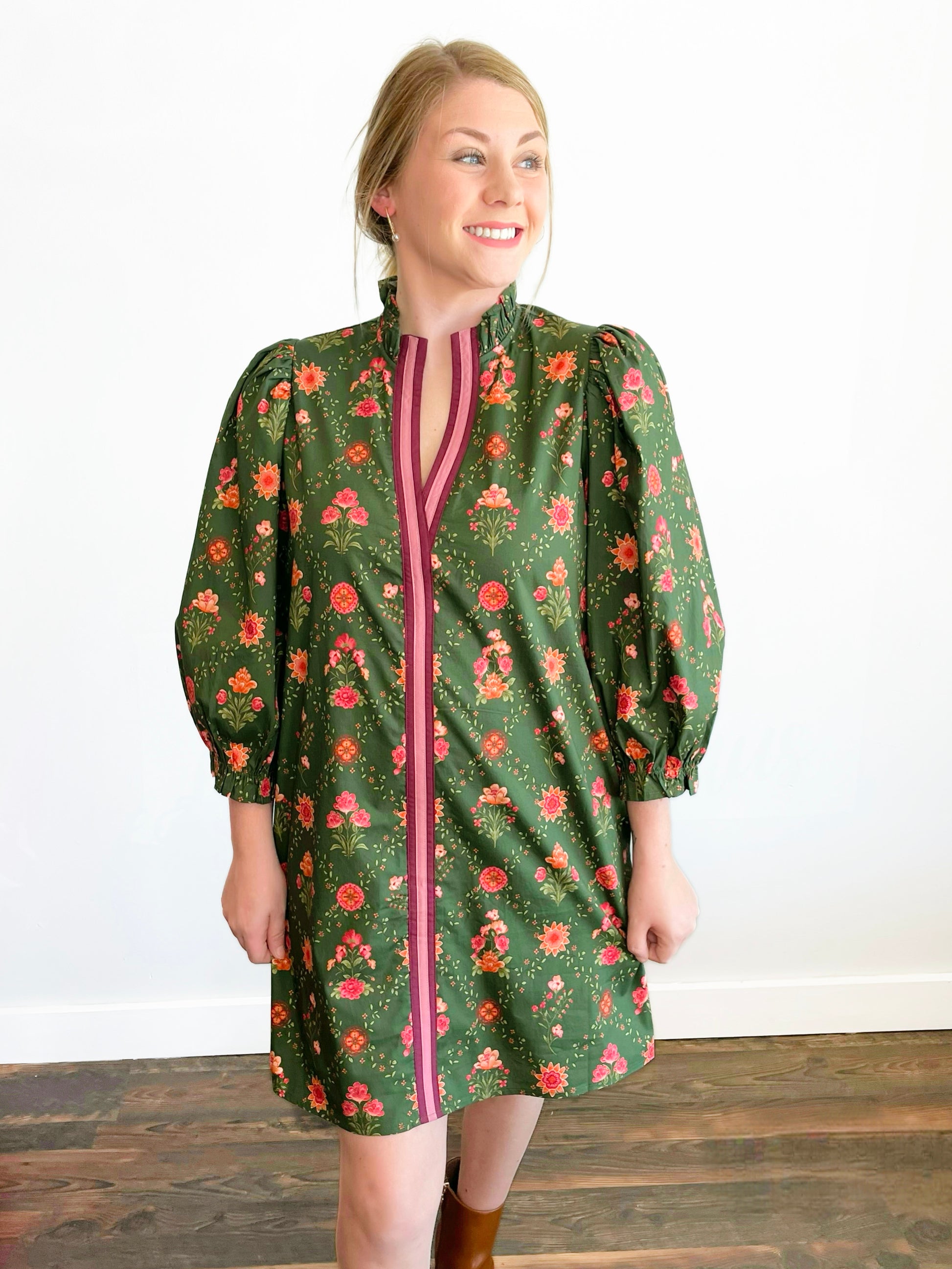 Embrace autumn charm with the Carter 3/4 Puff Sleeve Floral Dress. Its playful puff sleeves and ruffled band collar with contrast trim add a fun touch, while side pockets bring practical ease. Perfectly lined for comfort, this mini dress shines for family photos, workdays, church, or everyday adventures.