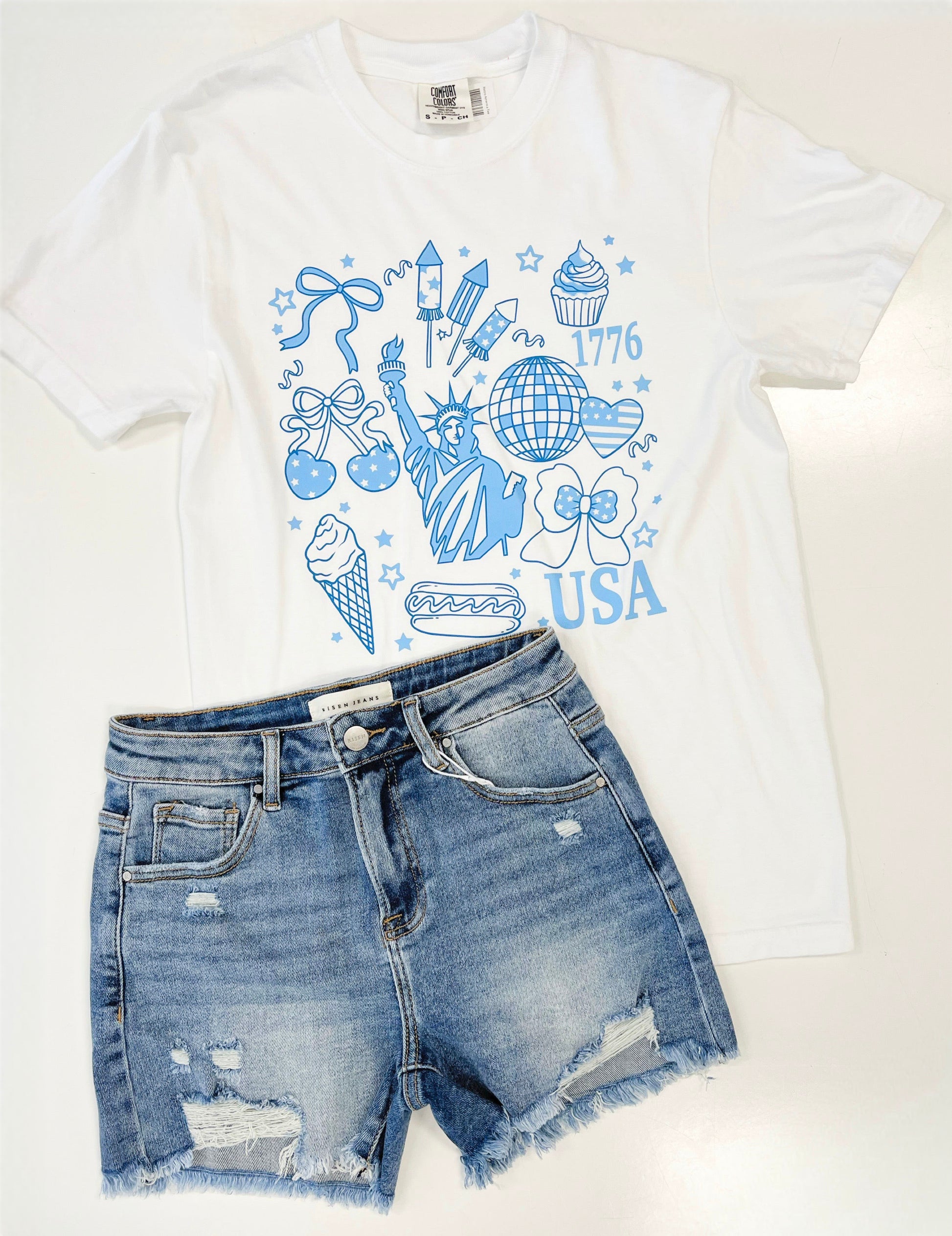 Celebrate all things red, white, and blue with our Retro America Tee! This playful shirt showcases iconic American symbols like fireworks, Lady Liberty, and summertime favorites (hello, hot dogs and ice cream!). Perfect for showing your patriotic spirit at barbecues, parades, or just because you're proud to be an American. Stars and stripes never looked so cool!