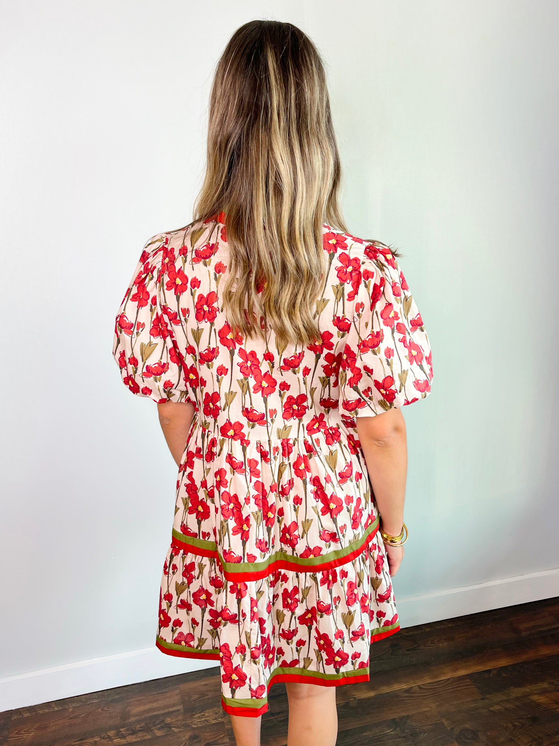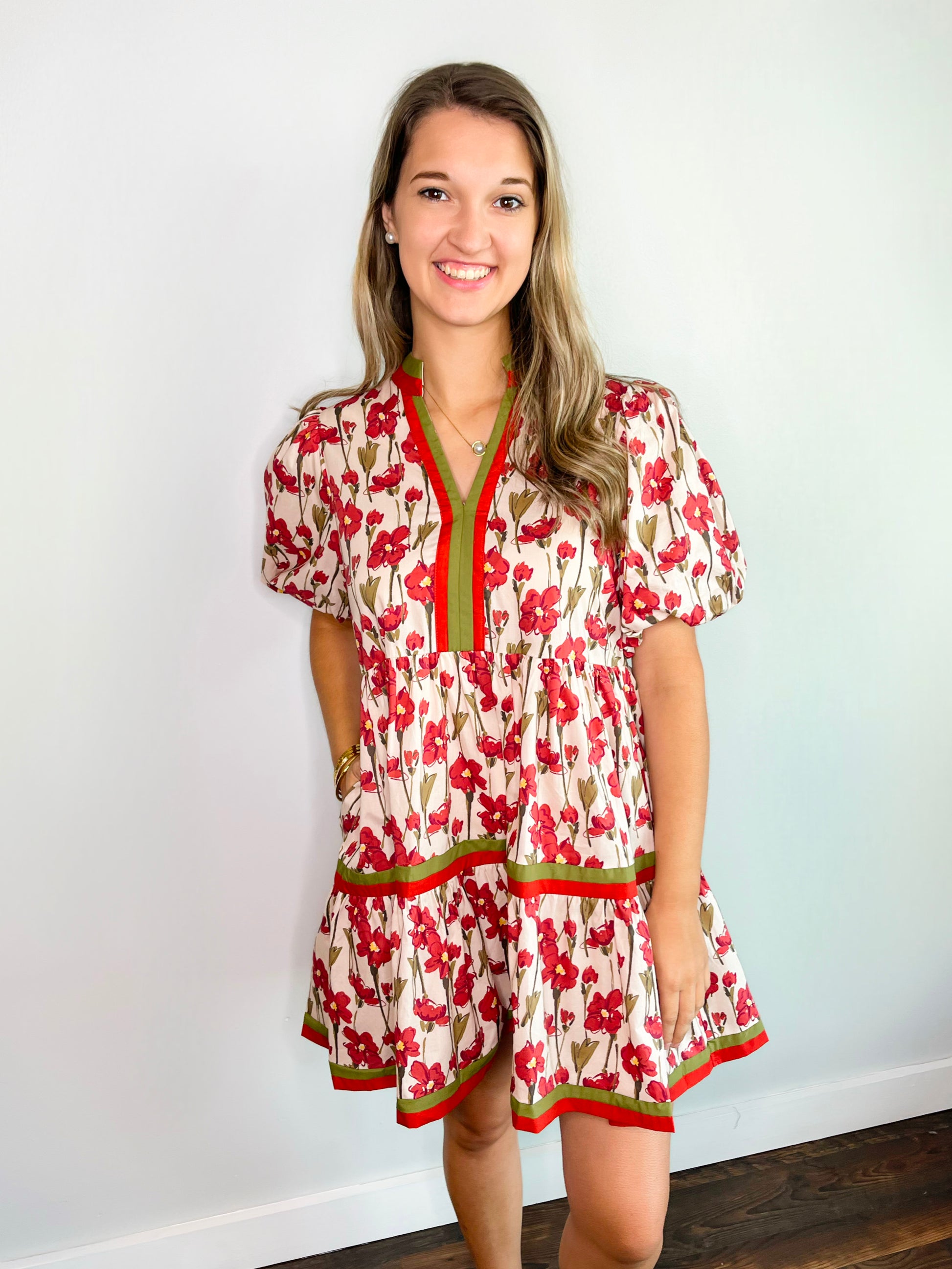 Add a splash of whimsy to your wardrobe with the Drea Floral Short Sleeve Dress. This playful tiered mini dress features short bubble sleeves and a charming multicolor band accent that highlights its floral print. Side pockets add a handy touch of convenience, perfect for keeping essentials close. Designed for breezy fall days, it’s a fun, flirty choice to brighten your seasonal looks.