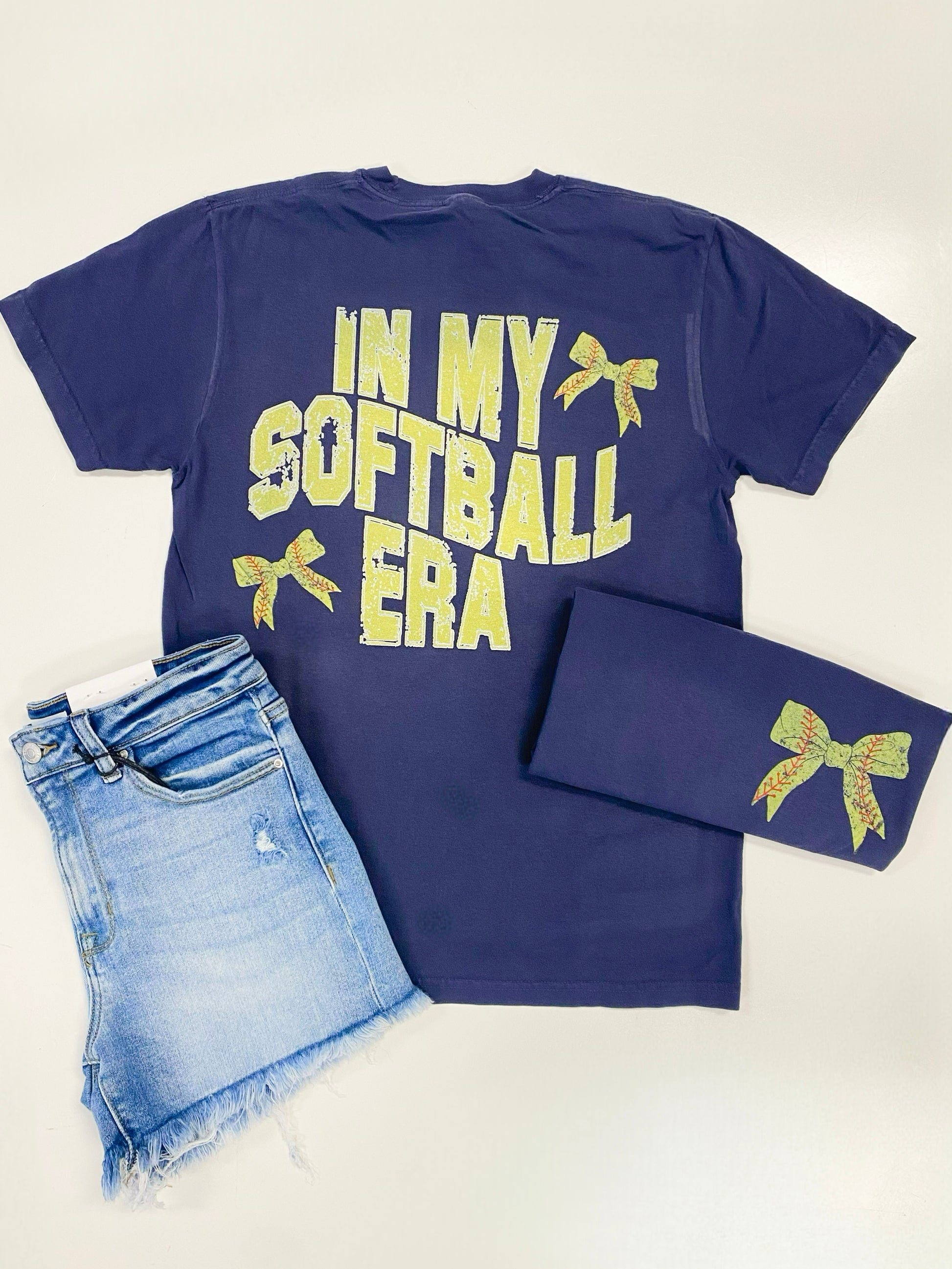 Celebrate the good old days with our In My Softball Era Tee. This playful tee features a softball bow on the front and a cute bow detail on the back. Perfect for any softball fan or anyone looking to add a quirky touch to their wardrobe. Batter up!