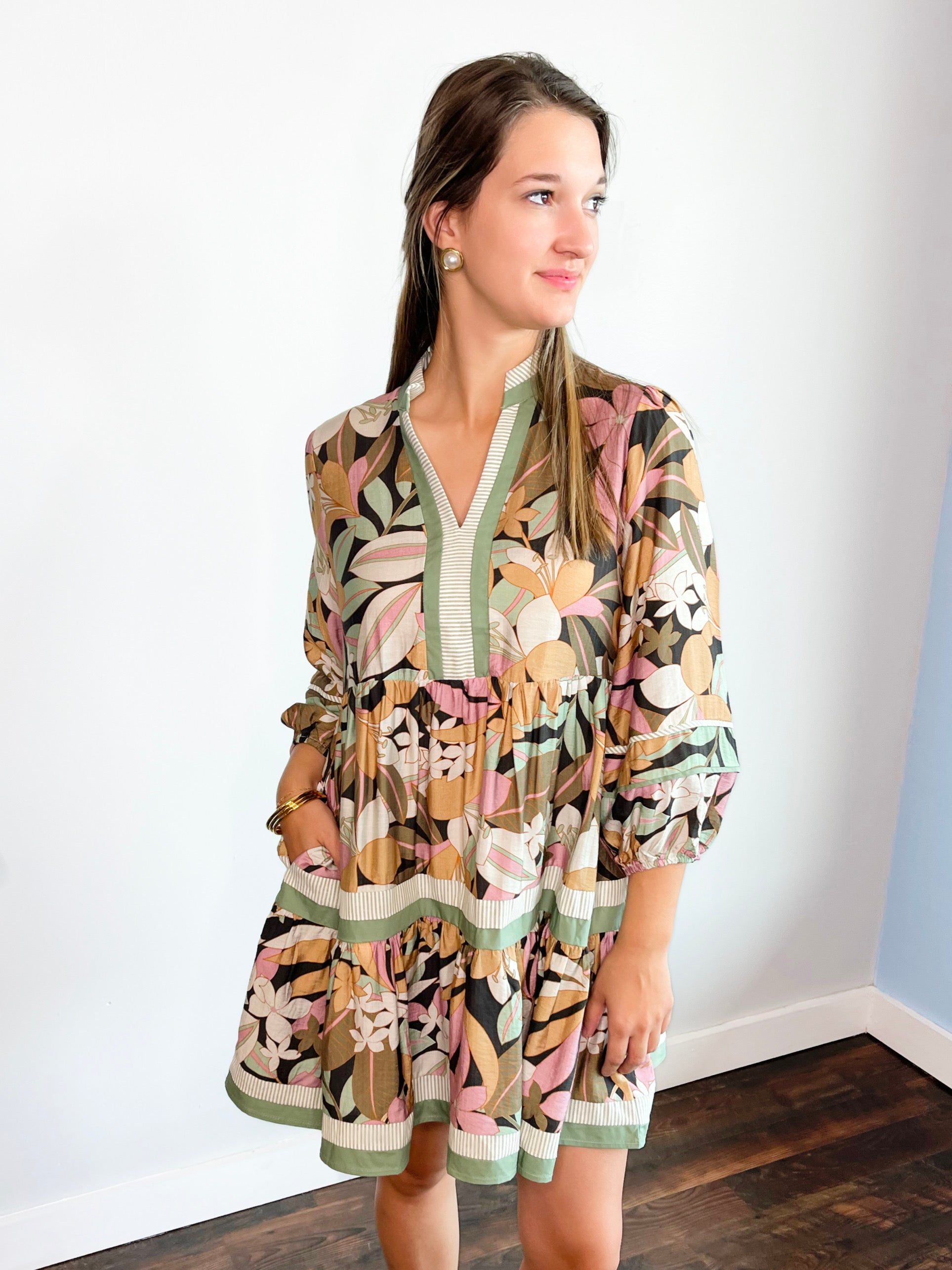 Bring playful charm to your fall wardrobe with the Irene Floral Tiered Dress. Featuring 3/4 sleeves and a subtle mock neckline, this dress combines solid and stripe contrasts for a fresh twist. The tiered layers add movement and flair, while handy side pockets keep essentials close. Perfect for crisp autumn days, it’s a delightful mix of comfort and style that brightens your seasonal looks.