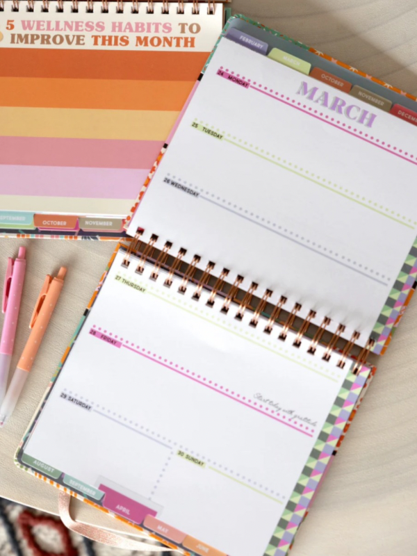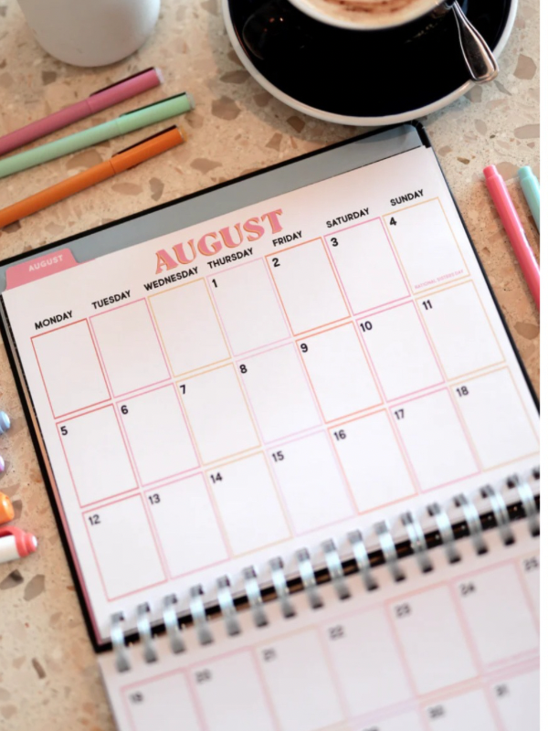 - 17 months starting in August 2024- December 2025 with a full month calendar & weekly (with Monday designated as the 1st day of the week) breakdowns for each month