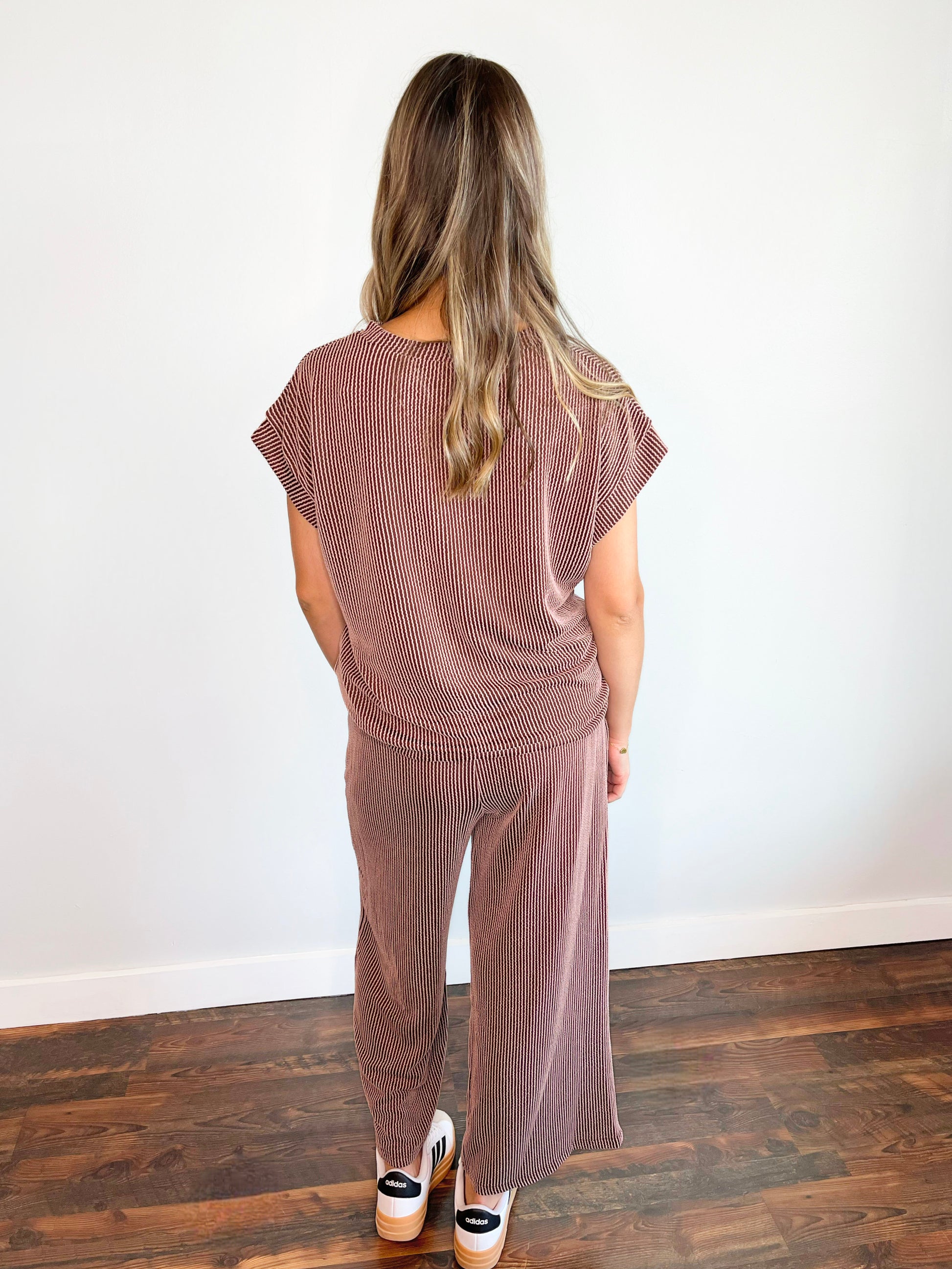 Get cozy and chic with the Jasper Ribbed Knit Set! This playful two-piece features a roomy oversized top with dolman sleeves and wide-leg pants that tie at the waist for the perfect fit. The subtle vertical stripes add a fun texture, while the buttery-soft fabric keeps you comfy all day long. Perfect for lounging, traveling, or just adding a stylish twist to your casual look!