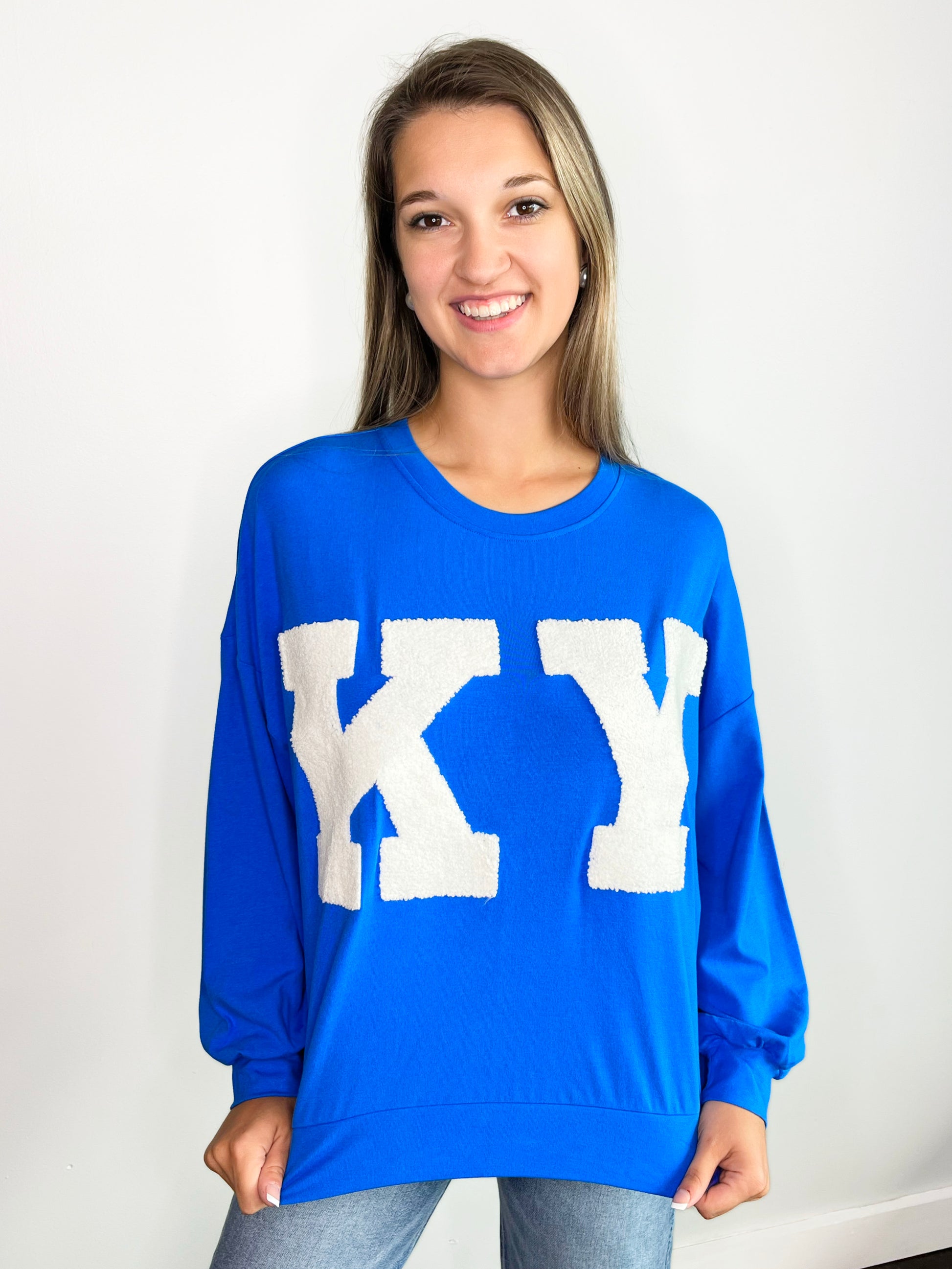 Step into cozy comfort with the KY Chenille Patch Oversized Top. Featuring a round neckline, relaxed drop shoulders, and a KY chenille patch. Long sleeves and banded details on the neckline, hemline, and cuffs add a snug finish, making it perfect for lounging or layering with flair. Its oversized fit brings effortless style and all-day ease.