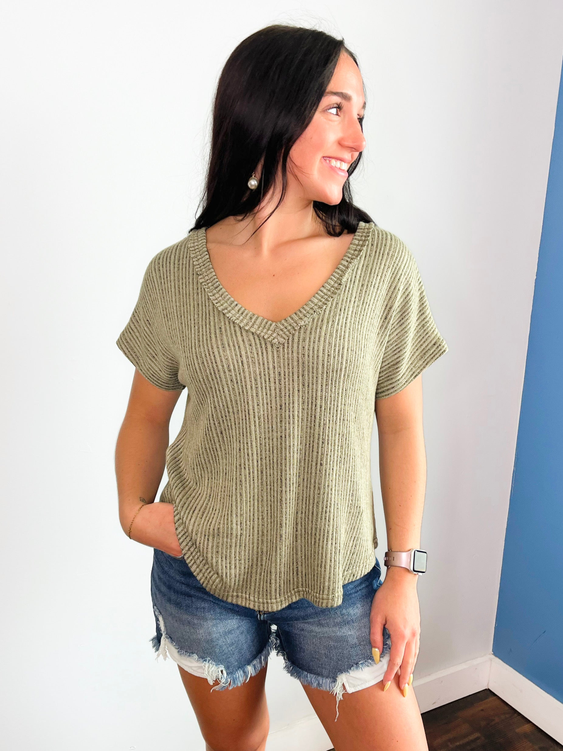 Get ready to rock this Landon Ribbed Knit Top! Featuring a playful V neckline, short sleeves with extended shoulders for extra comfort, and a relaxed fit for a laid-back yet stylish look. This ribbed knit top makes it perfect for warmer days. Its boxy shape and unique U hem add a touch of quirkiness to any outfit. Don't miss out on this must-have piece!