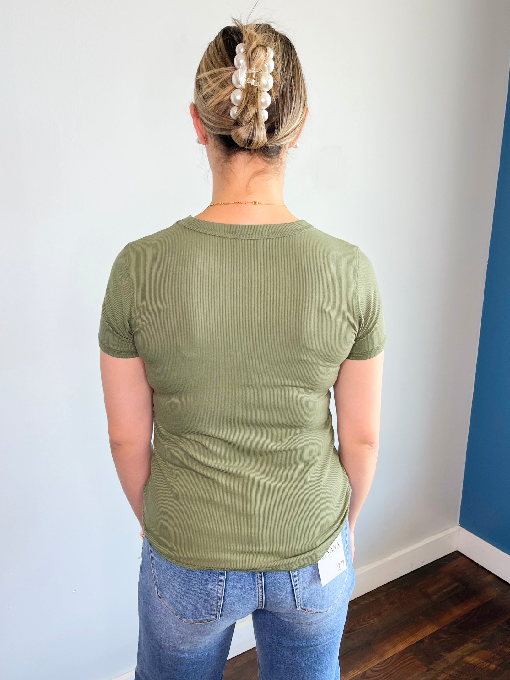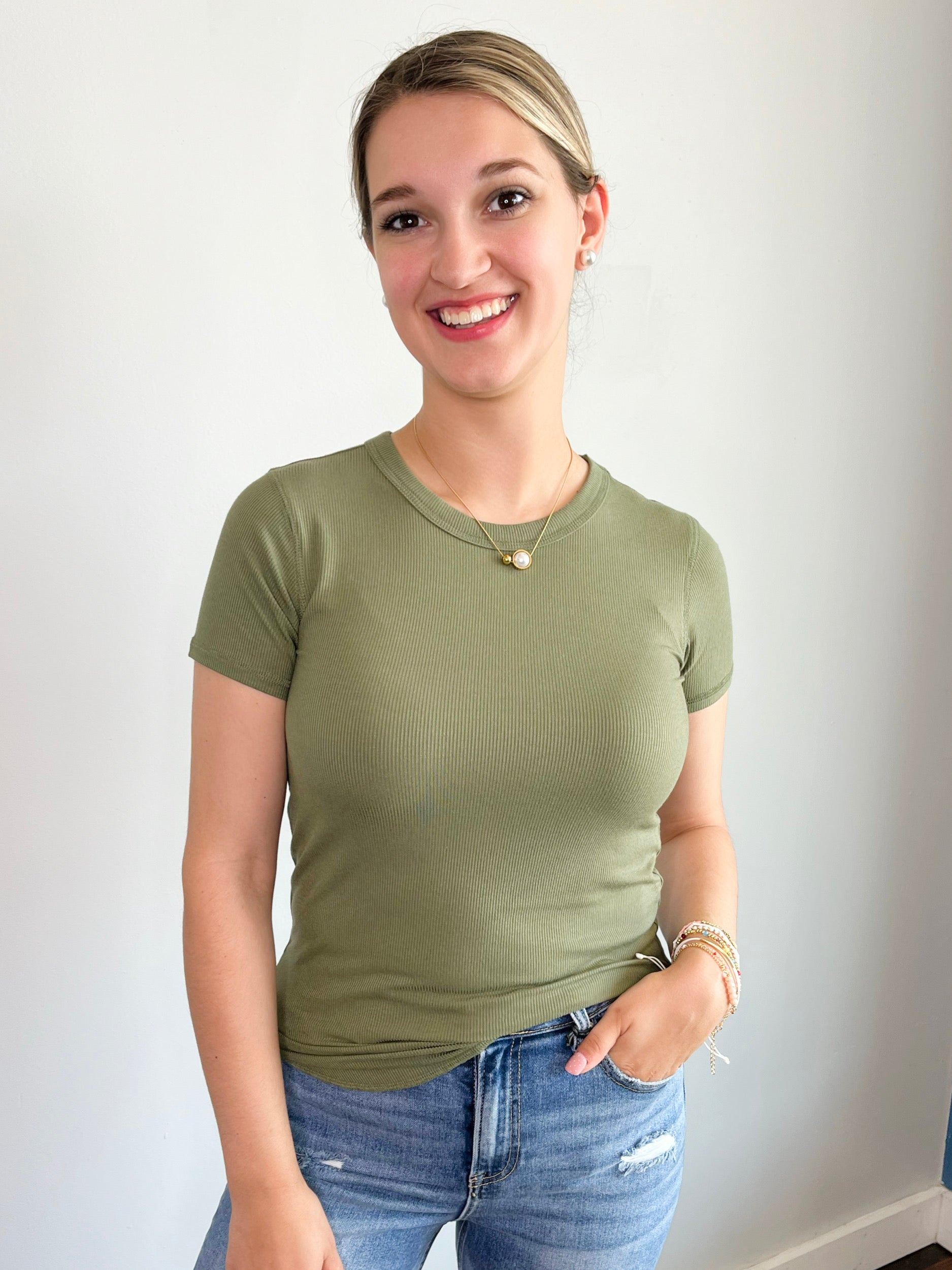Get the Laura Basic Ribbed Tee! This round-neck tee features a ribbed design and curved hem for a flattering fit. Perfect for any casual look (or lazy day)!