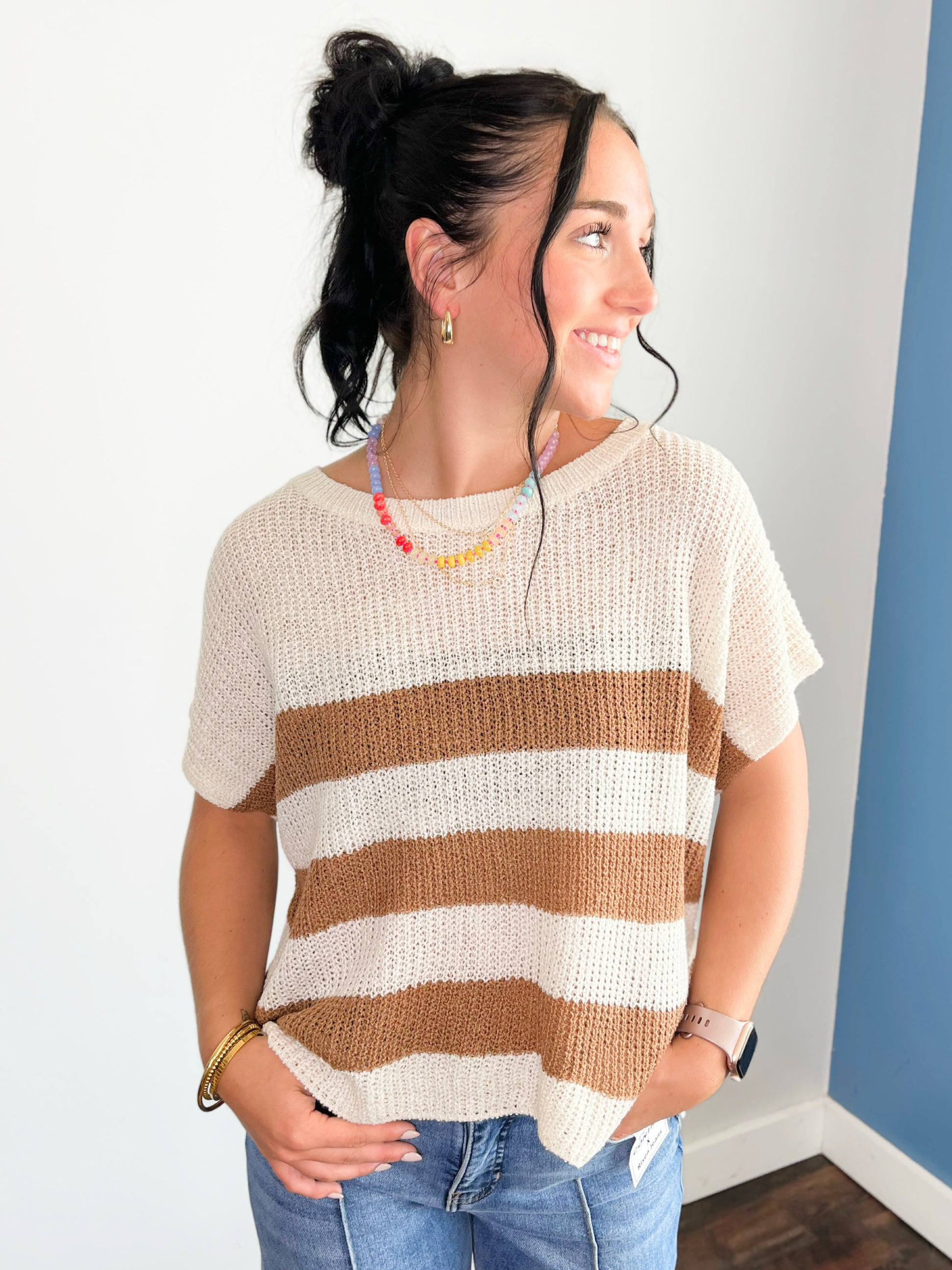 This Lola Striped Knit Top in Mocha is your new go-to for effortless style. Lightweight and comfy, it features short sleeves and a trendy high-low hem that adds a fun twist to your look. Perfect for transitioning from summer to fall.