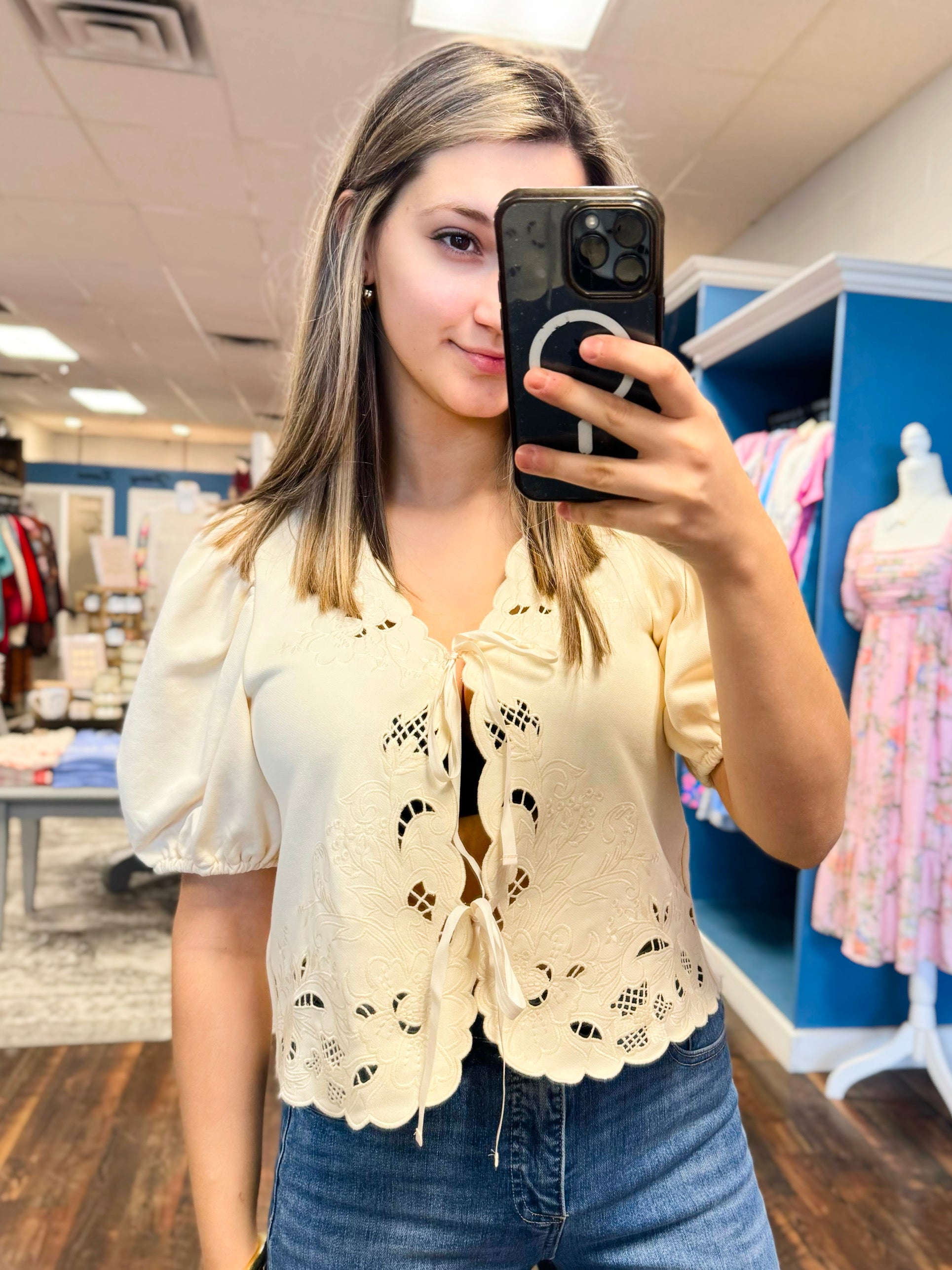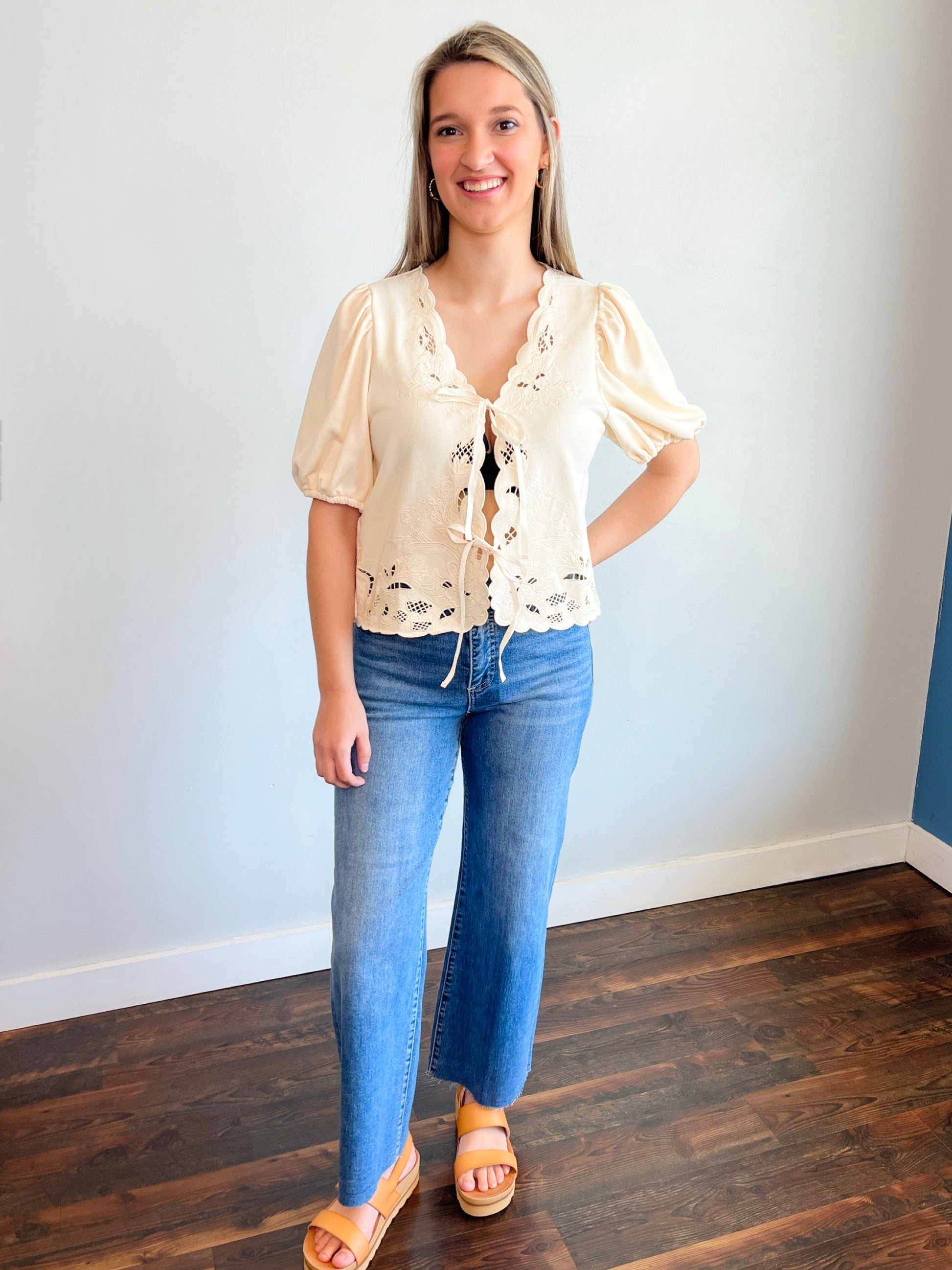 Lydia Puff Sleeve Bow Tie Closure Top | Ecru
