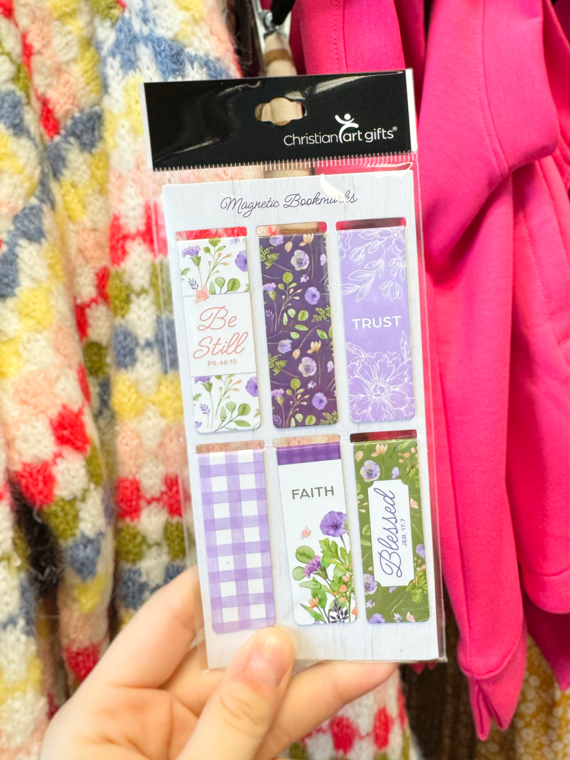 The cheerfully trimmed New Mercies Purple and Green Magnetic Bookmark Set features encouraging sentiments to inspire you to walk by faith and trust that God is good.