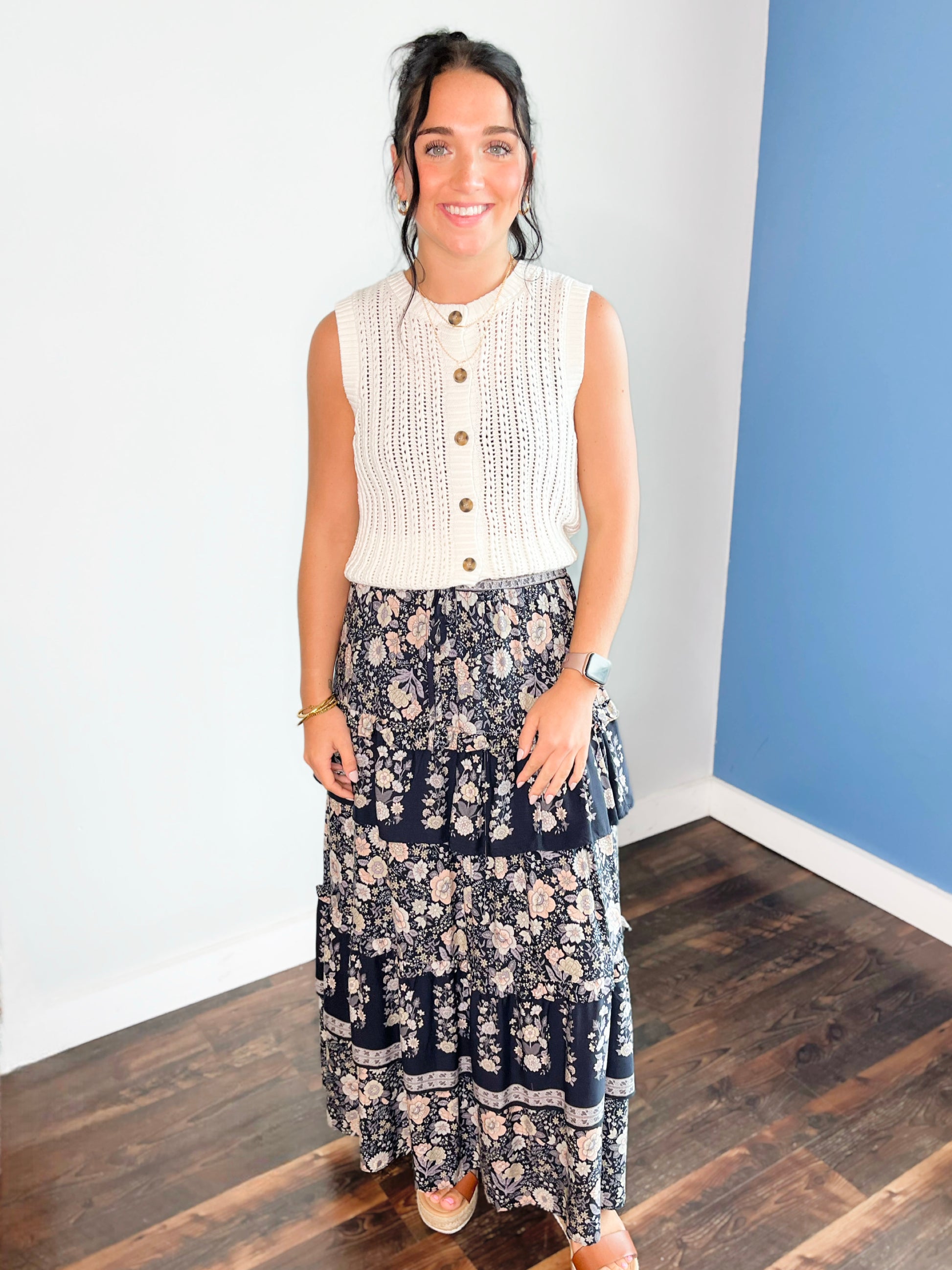 Bring a playful touch to your wardrobe with the Mazi Printed Ruffled Tiered Midi Skirt. Featuring a smocked elastic waistband with a charming tie detail, this skirt offers a comfortable, flattering fit. The lively floral print is beautifully accented by a contrasting floral border and tiered ruffles, adding movement and fun to every step. Fully lined for ease and comfort, it’s perfect for gorgeous days and casual outings.