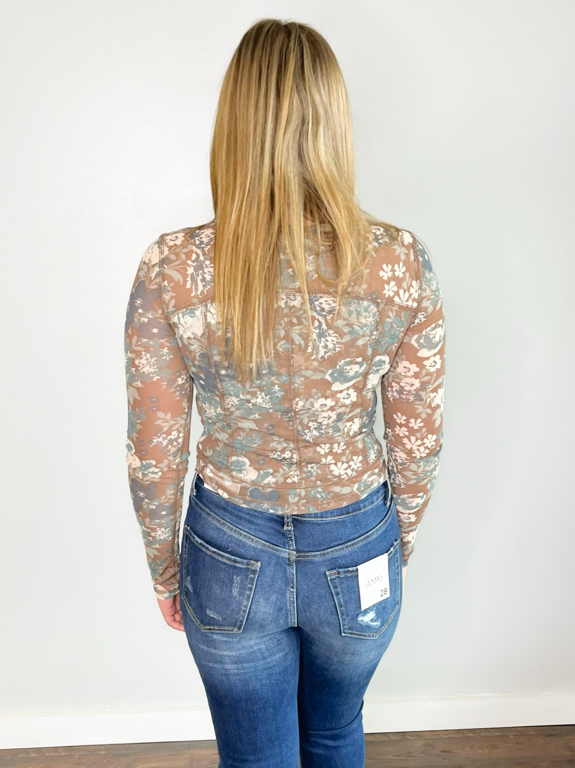 Stay stylish and on-trend with this Millie Floral Print Mesh Top in Brown. The semi-sheer sleeves and frame fitting stitching with double mesh add a touch of edginess to this floral print long sleeve top. Perfect for a night out or casual day look, wear alone or layer under your favorite dress, tee, top, or jumpsuit.