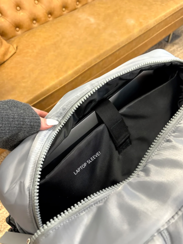 - Padded laptop sleeve on the front of the interior measures 18: L X 9 3/4" T with a velcro closure