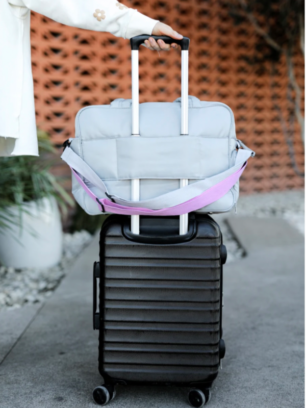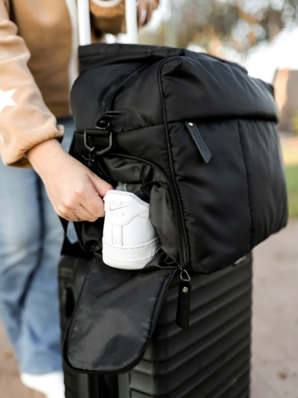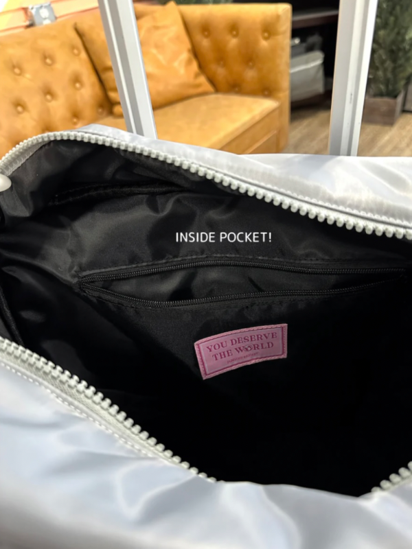 - Wrap around zipped shoe compartment on the right opens to a lined pocket that is 14 3/4" long