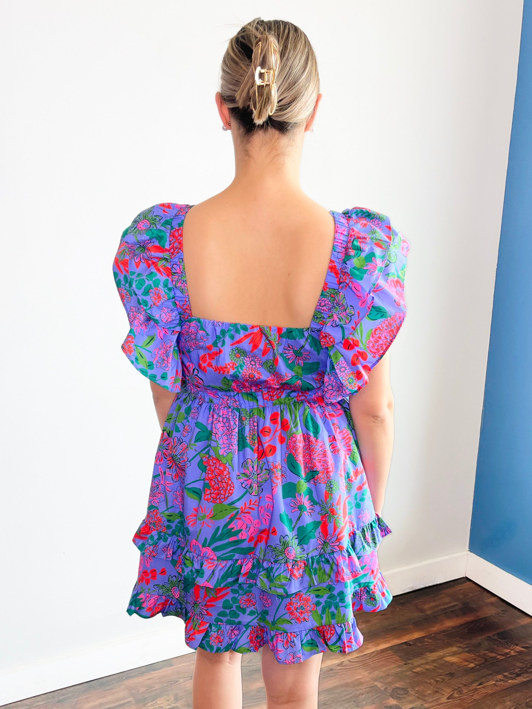 Step out in style with our Remy Floral Poplin Ruffled Dress in purple. With a playful v-cut neckline, ruffled sleeves, and ruffle detail on the neckline and skirt, this mini dress is perfect for any fun occasion. Made of soft cotton poplin, it also features an elastic neckline and waist for a comfortable and flattering fit.