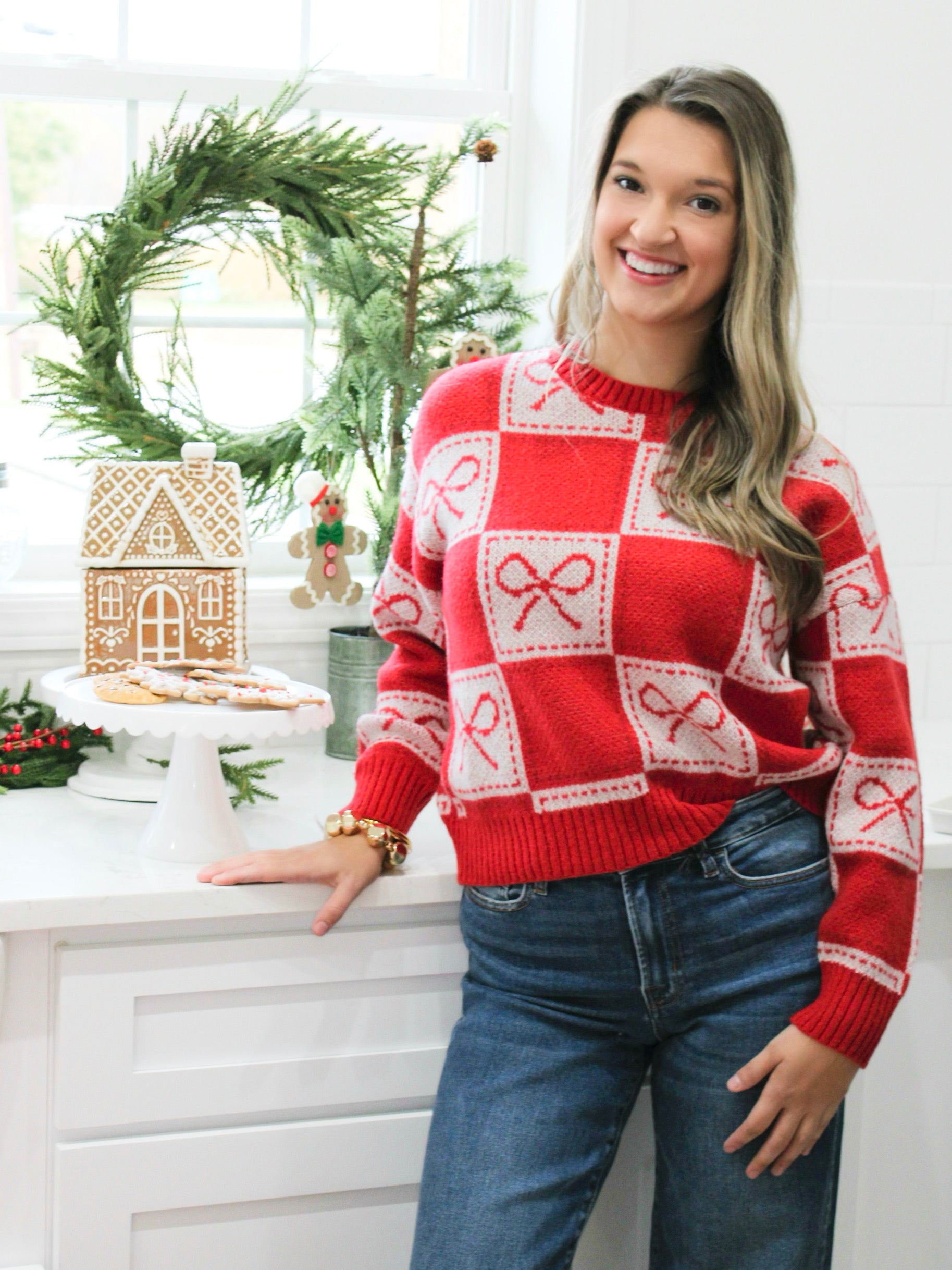 Get festive with the Sylvie Checkered Bow Sweater—the perfect holiday essential! This charming pullover showcases an adorable checkered bow pattern in jacquard knit that brings instant seasonal cheer to your wardrobe. With its cozy crew neckline, long sleeves, and relaxed drop shoulder fit, it's designed for comfort without sacrificing style. Whether you're gathering with loved ones, attending holiday parties, or simply spreading winter warmth, this sweater delivers playful elegance that captures the magic of the season. Dress it up or keep it casual—either way, you'll be spreading smiles!
