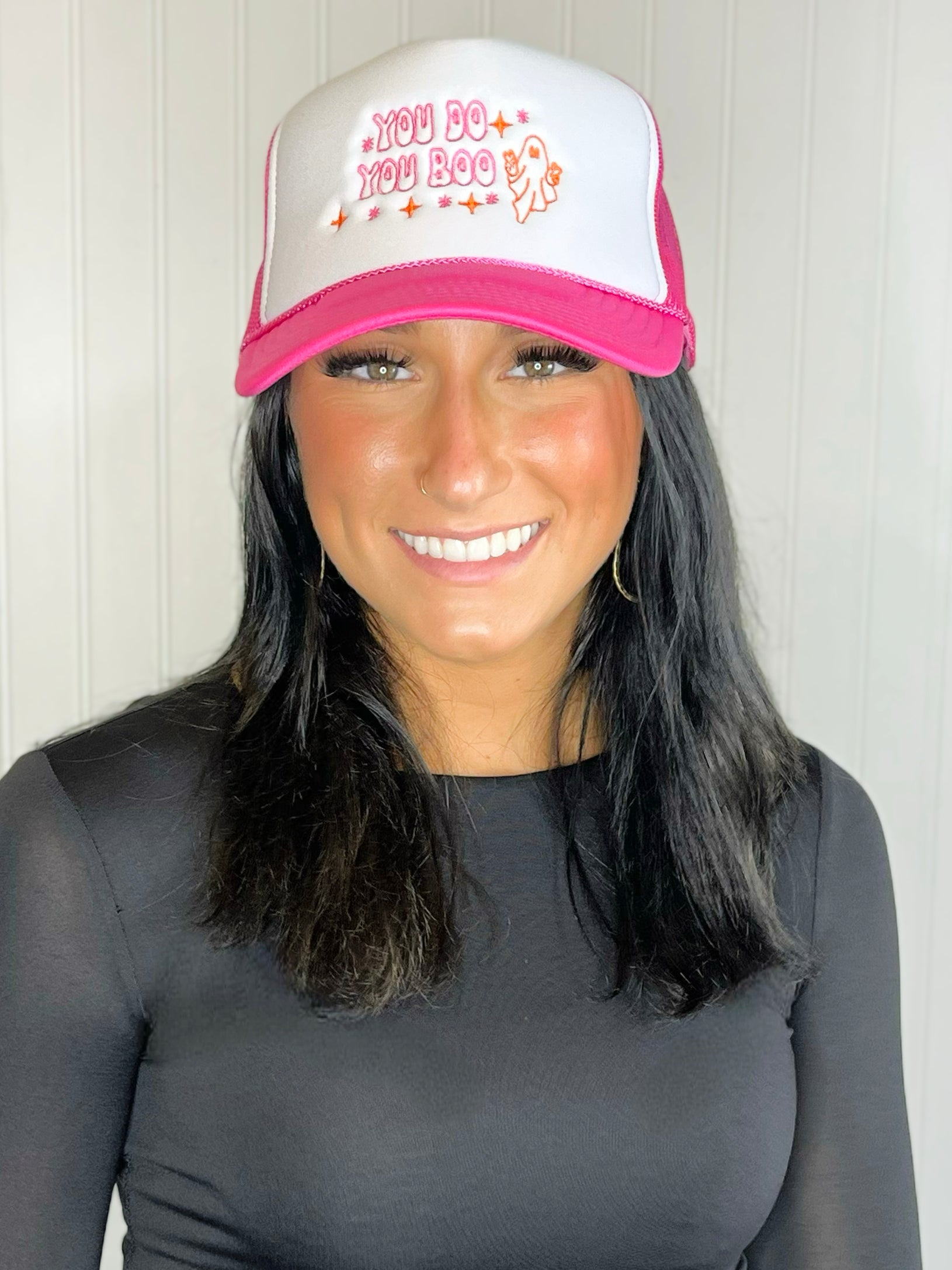 Ready to make a statement? Embroidered with "You Do You Boo," our pink trucker hat will have you standing out in a crowd. You do you, boo.